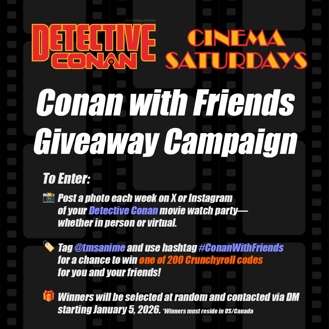 But like many things in Detective Conan, good things come in pairs— with just 10 weeks to go until the Detective Conan anime 30th anniversary, we’re unlocking the Conan with Friends giveaway campaign for the final stretch of Cinema Saturdays! Starting November 1st, recruit your friends to your weekly Detective Conan Cinema Saturdays watch party and share a photo—whether in person or virtual—on X or Instagram, tag @tmsanime, and use the hashtag #ConanWithFriends for a chance to win one of 200 Crunchyroll codes for you and your friends. Winners will be selected at random and contacted via DM beginning January 5, 2026. Winners must reside in the US/Canada.