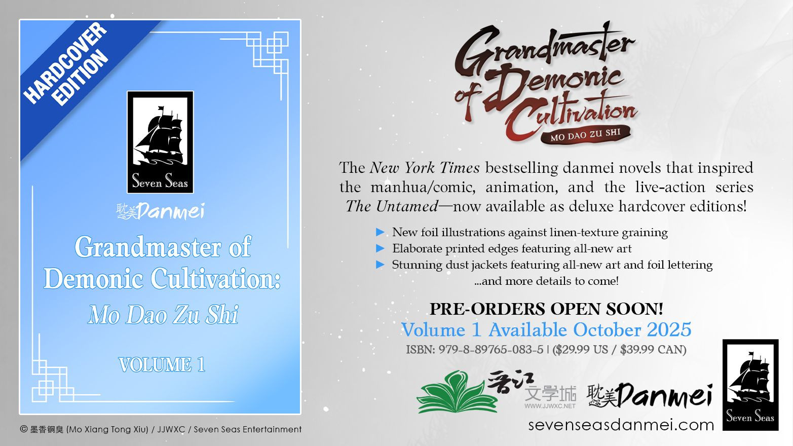 New danmei announcement! ✨ GRANDMASTER OF DEMONIC CULTIVATION: MO DAO ZU SHI, the NYT bestselling novel series by Mo Xiang Tong Xiu will be rereleased in deluxe hardcover editions! sevenseasentertainment.com/2025/04/23/s…