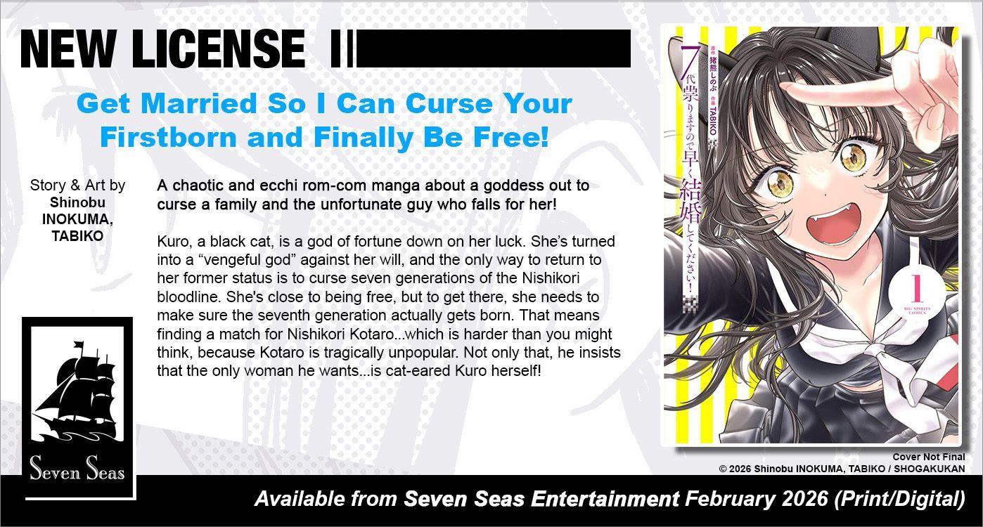 Brand-new license announcement! GET MARRIED SO I CAN CURSE YOUR FIRSTBORN AND FINALLY BE FREE! by Shinobu INOKUMA and TABIKO. A chaotic and ecchi rom-com manga about a goddess out to curse a family and the unfortunate guy who falls for her! sevenseasentertainment.com/2025/05/14/sev