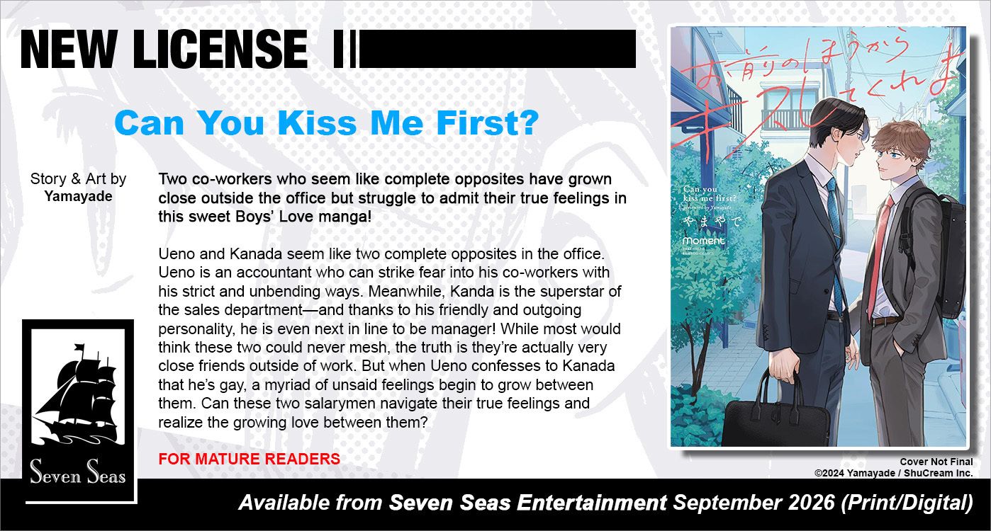 Brand-new license announcement! CAN YOU KISS ME FIRST? by Yamayade. Two co-workers who seem like complete opposites have grown close outside the office but struggle to admit how deep their feelings truly are in this sweet Boys’ Love/#BL manga! sevenseasentertainment.com/2025/10/01/sev