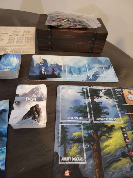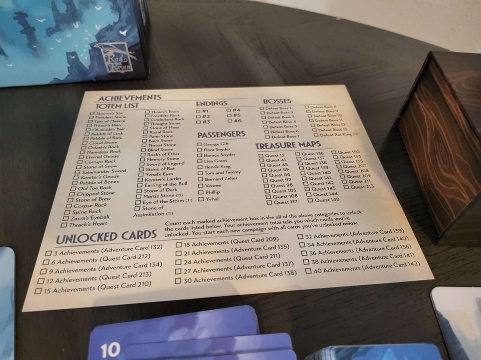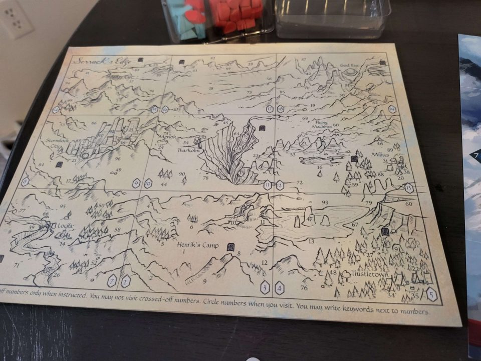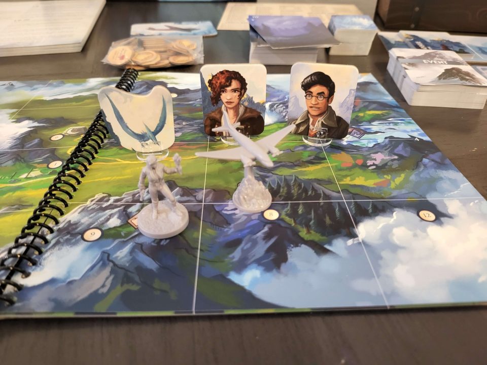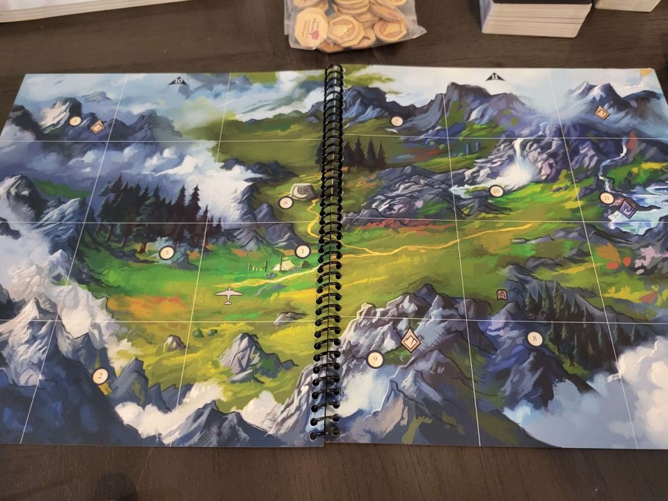 Components are top-tier: a spiral-bound atlas that lays flat beautifully, a thick storybook with hundreds of branching entries, character folios with health/stamina trackers, wooden resource tokens (food, wood, iron), gem quest markers, and a chunky plane miniature that looks right at home soaring across the table. The wooden time token and status cubes add tactile delight. Setup/teardown is reasonable for a campaign game, though the box is hefty – many players add organizers for longevity. No deluxe edition needed; this is premium out of the box.
