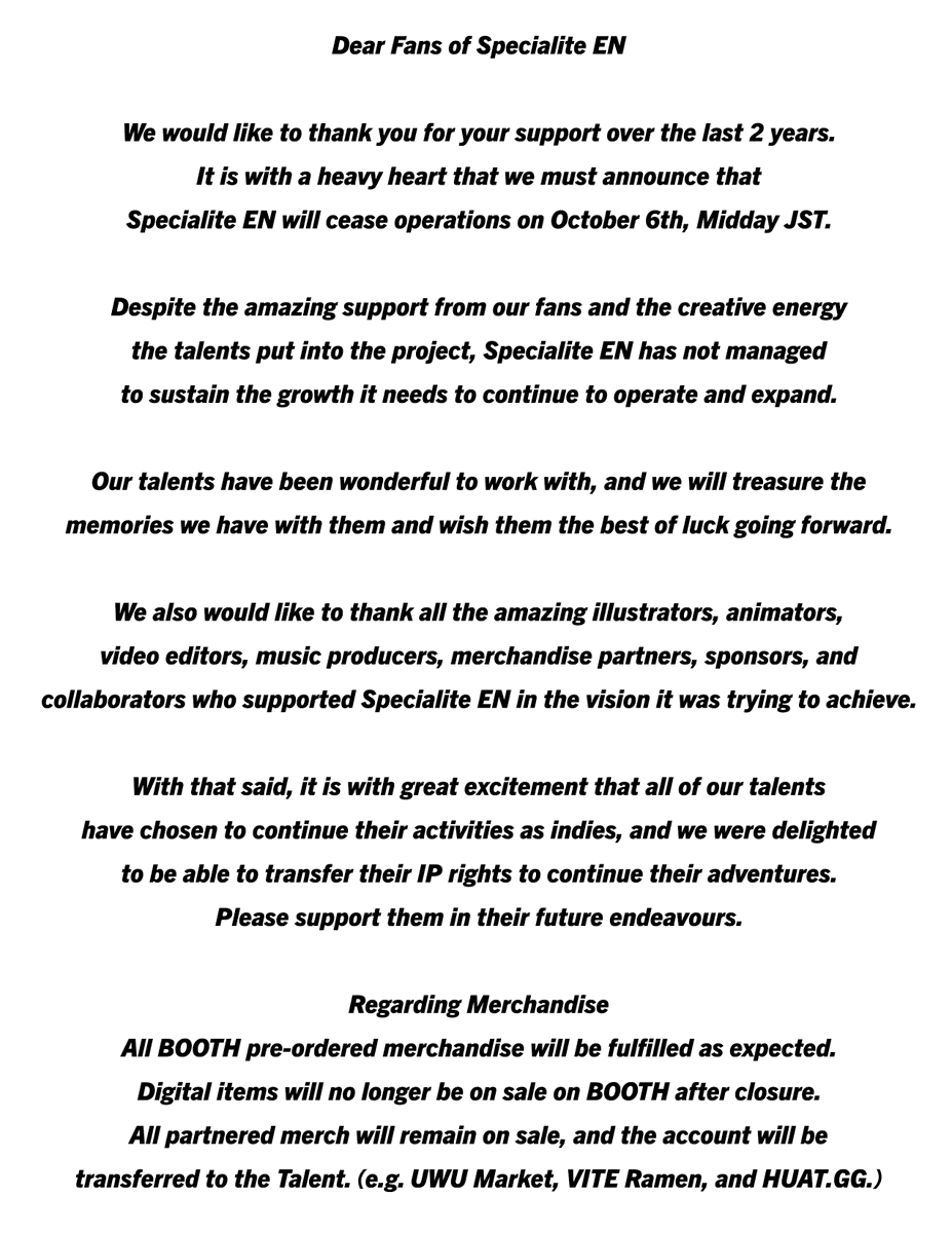 The gamer-focused VTuber group Specialite announced that it is ceasing operations of its English branch, Specialite EN, effective October 6, Midday JST.