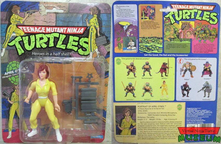 Card Back Text: April’s a determined TV news journalist, always prepared for the late-breaking news feature with her camcorder strapped ’round her arm. Her eagerness, however, gets her into trouble and makes her a big pain in the shell for the Turtles, who always end up saving this damsel in distress. Still, April’s no airhead and is a valuable member of the Turtle Team. Being a pretty human has its advantages, like getting into places the Turtles can’t. When the situation calls for more than a news flash, April’s ready with a trusty gun, which is secretly locked inside her camcorder.