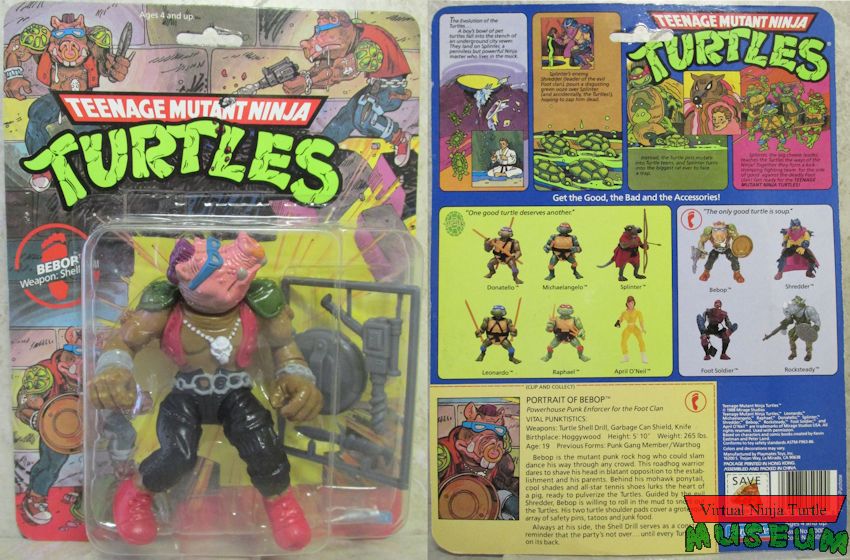 Card Back Text: Bebop is the mutant punk rock hog who could slam dance his way through any crowd. This roadhog warrior dares to shave his head in blatant opposition to the establishment and his parents. Behind his mohawk ponytail, cool shades and all-star tennis shoes lurk the heart of a pig, ready to pulverize the Turtles. Guided by the evil Shredder, Bebop is willing to roll in the mud to snort out the Turtles. His two turtle shoulder pads cover a grotesque array of safety pins, tattoos, and junk food. Always at his side, the Shell Drill serves as a constant reminder that the party’s not over … until every Turtle lies on its back.