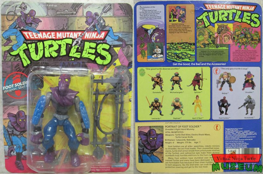 Card Back Text: Foot Soldier are alike: speechless, robotic minions to Shredder, the evil Foot leader. Their mummified movements, turtle shell armor (made from unfortunate relatives of the Turtles), and radioactive eyes make these skeletal scumballs truly horrible additions to the Foot Clan. Many Foot Soldiers have stumbled over the Ninja-trained Turtles and many have been destroyed. Still, they are formidable foes because of their sheer numbers. Their high-tech weapons, like the shell biter, can crush the Turtle’s protective covering and get to the real meat.