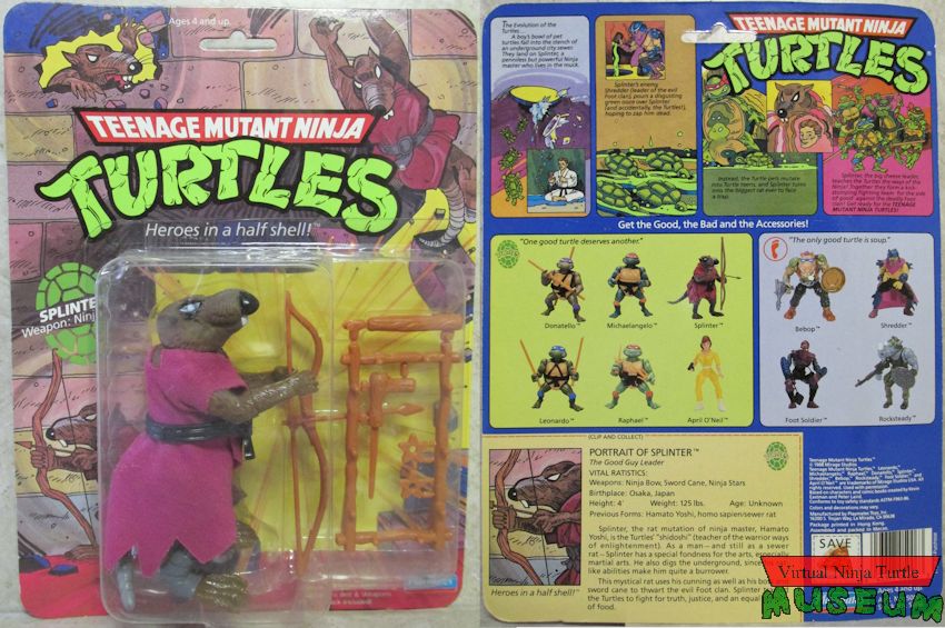 Card Back Text: Splinter, the rat mutation of a ninja master, Hamato Yoshi, is the Turtles’ “shidoshi” (teacher of the warrior ways of enlightenment). As a man – and still as a sewer rat – Splinter has a special fondness for the arts, especially martial arts. He also digs the underground, since his rat-like abilities make him quite a burrower. This mystical rat uses his cunning as well as his bow and sword cane to thwart the evil Foot clan. Splinter trained the Turtles to fight for truth, justice, and an equal portion of food.