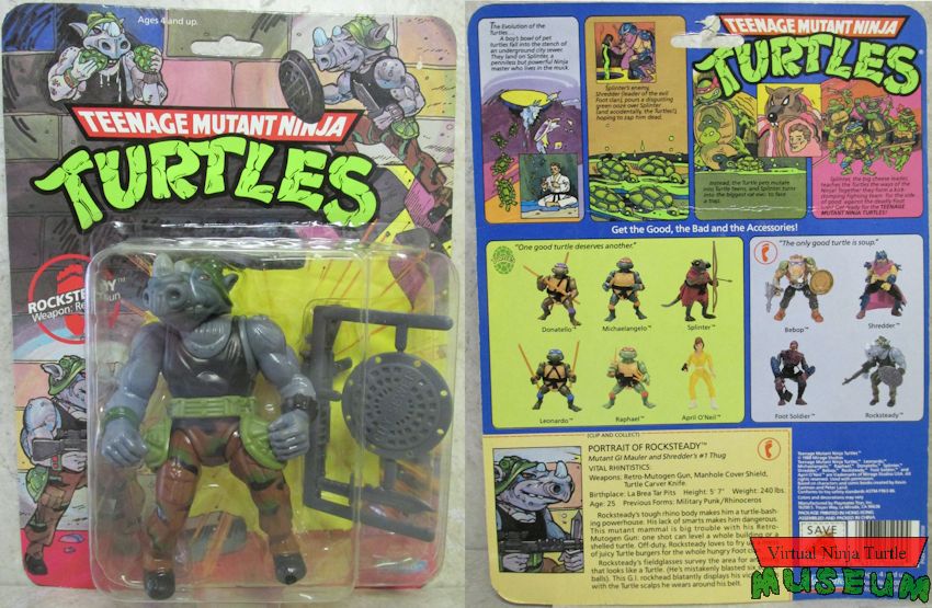 I love how Rocksteady got a “Retro-Mutagen” gun, which looks like a military level M-16 machine gun. I know, I know, this is one of those censorship things about using realistic names or weapons or something just so the precious kids wouldn’t go looking for the real gun thinking that they could turn Teenage Mutant Ninja Turtles back into regular Turtles or something like that. As for the toy itself, I’m cool with the prices but I have to wonder why the two goofs are higher priced than Shredder, the main villain.