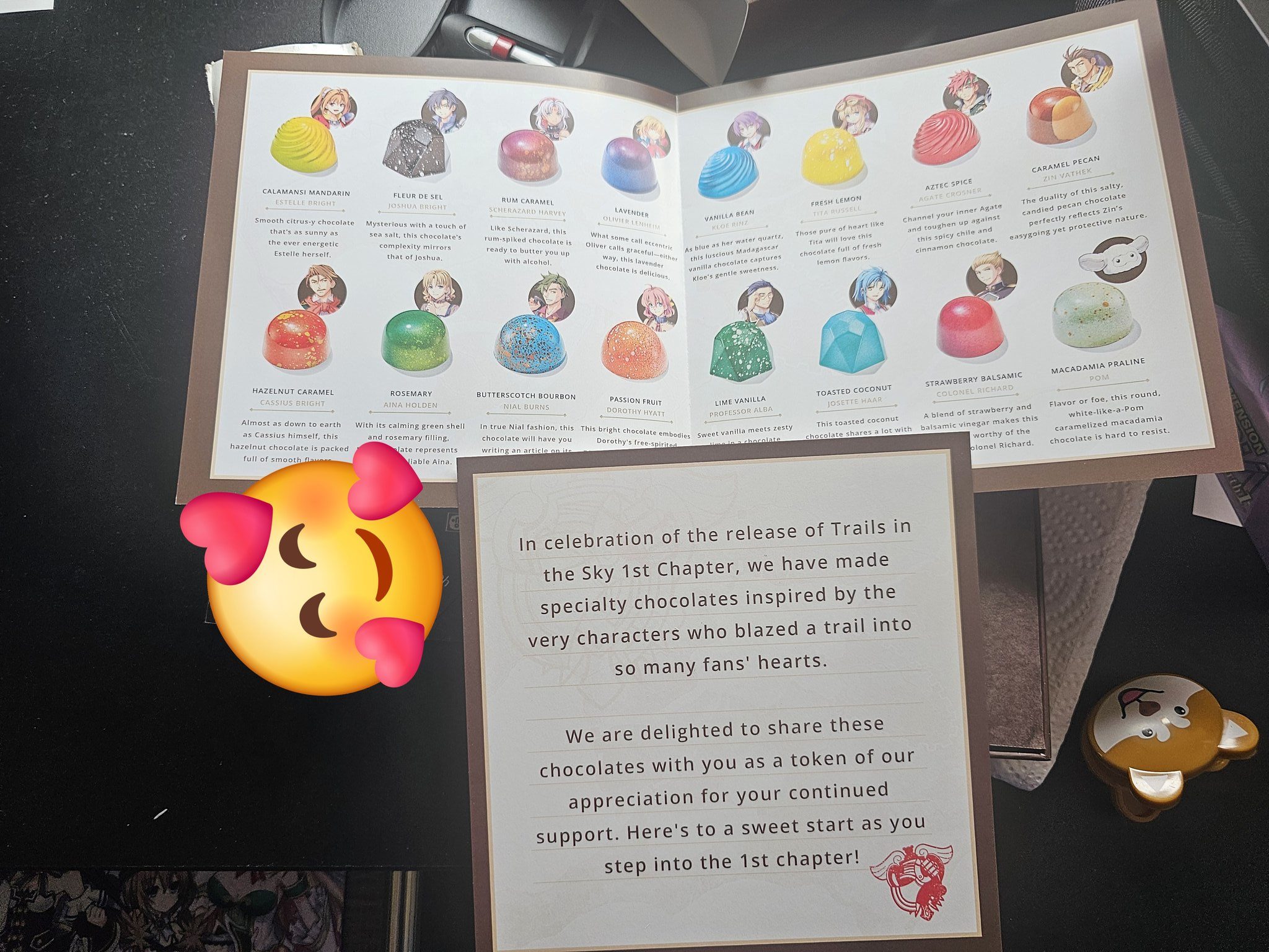 DISCLAIMER: I will likely reveal spoilers for Trails in the Sky FC due to how the chocolate relates to the character. It will feel weird to discuss the taste, the flavors, without talking about how they relate to the specific characters they are made for. I will keep spoilers light, though!