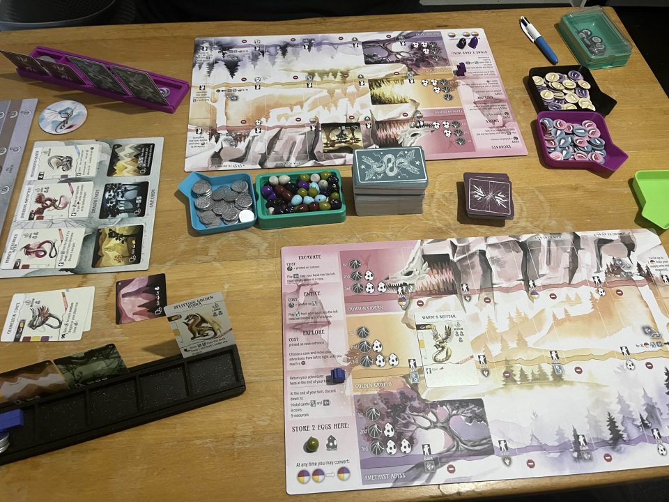 The game also scales beautifully. I’ve enjoyed it with two players, where it feels more like a duel of wits, and with four players, where the competition for dragons and cave spaces creates lively interaction. Solo mode is thoughtfully implemented as well, continuing Stonemaier’s tradition of excellent AI opponents.